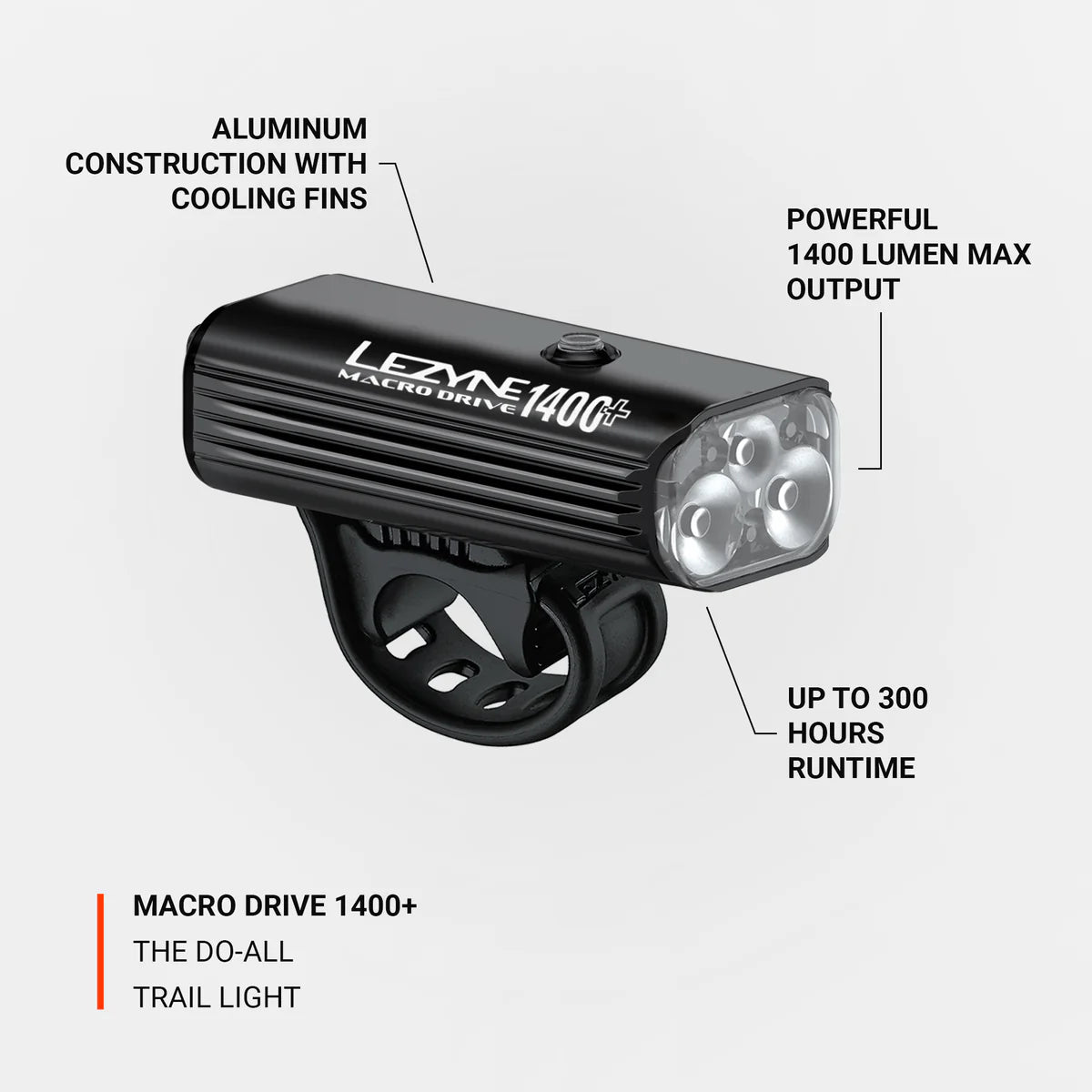The Lezyne Macro Drive 1400+ Front Bike Light delivers a powerful 1400 lumens through advanced Tri-Focus Optics, providing a wide, focused beam for optimal visibility on roads and trails. Designed for all-season performance, it features a rugged CNC-machined aluminum body with integrated cooling fins and IPX7 waterproofing.
