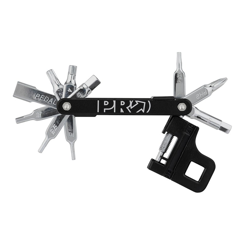 Designed to provide you with a better sports’ bicycle experience the PRO Mini Tool 22 Functions boasts 22 functions housed in a compact 6061 alloy body. Included in these is a chaintool, a chain holder, tyre lever, brake pad spreader, a range of hex keys, a PH2 screwdriver, two torx keys, four spoke wrenches as well as 7-, 8-, 9- and 10-millimetre wrenches.