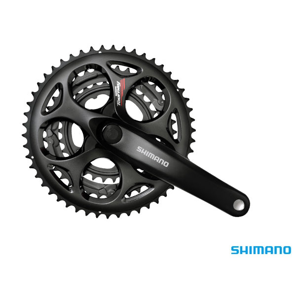 The SHIMANO TOURNEY A070 crankset is compatible with 3x7 and 3x8 drivetrains and provides wide range 50-39-34T gearing with a chain guard. It uses a square taper bottom bracket interface.
