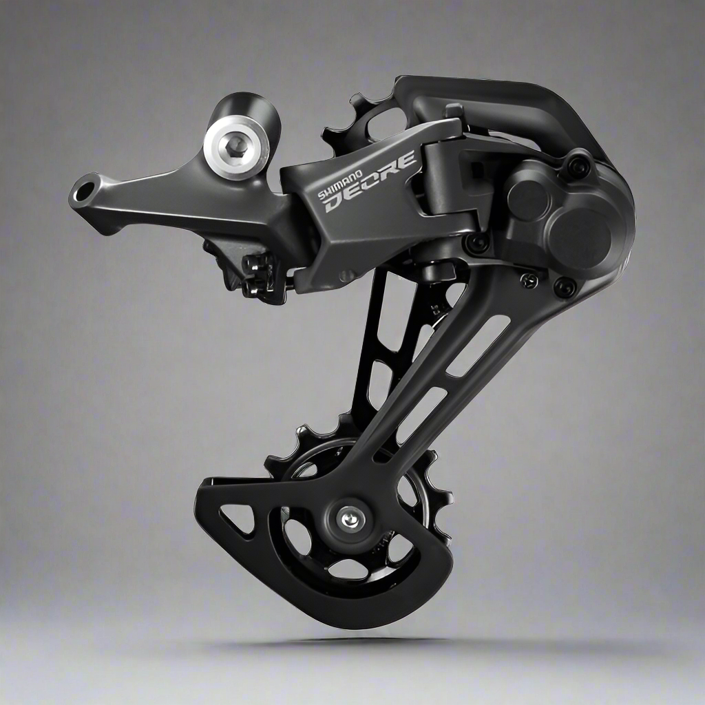 The Shimano Deore RD-M5100 rear derailleur is designed for 11-51T cassettes, combining an elegant yet aggressive angled design with larger 13-tooth pulleys. Engineered with Shimano’s proven Shadow RD+ low profile technology, it delivers precise and rapid shifting while reducing chain chatter and improving chain retention through a stiffer derailleur arm and higher chain tension.