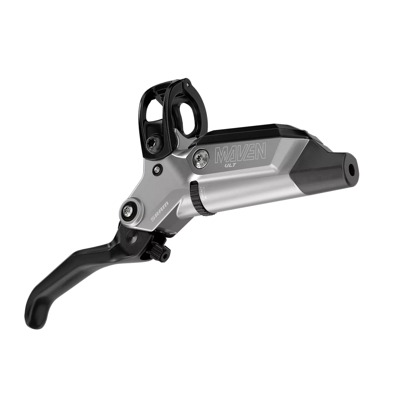 Modern mountain bikes have redefined what riders are capable of, pushing the requirements for heavy-duty power further than ever before. Maven Ultimate is our answer to that evolution, with monstrous 18 and 19.5-millimeter pistons driving 50% more power than Code. But best-in-class power means nothing unless you’re able to harness it. Swinglink translates rider input for progressive power throughout the lever pull, maintaining SRAM’s signature ride feel. And because of a stiff 4-bolt caliper that sheds an incredible amount of heat, that feel remains consistent, so the last corner feels like the first corner. But with so much baseline power on hand, there is more range than ever before to tune the ride qualities to exactly how you want with different pad materials, and rotor sizes. Maven Ultimate pairs a sleek high polish lever body to a caliper with machined edges and titanium hardware for a finish worthy of any modern super bike. And for unrivaled ease of customization, features tool-free Reach and Contact Point Adjust. Maven is the expert, but Maven Ultimate is the pinnacle.